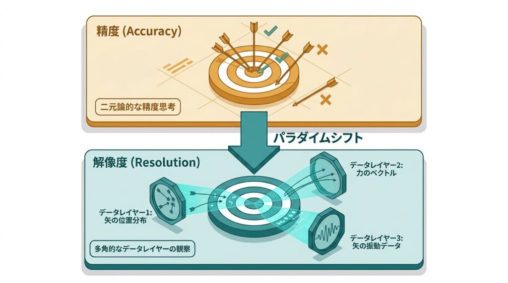 診断を「精度」で評価すると、「当たった/当たらない」の二択になる。「解像度」で捉えると、「どの側面を、どの条件下で、どの粒度で見ているか」という問いになる。